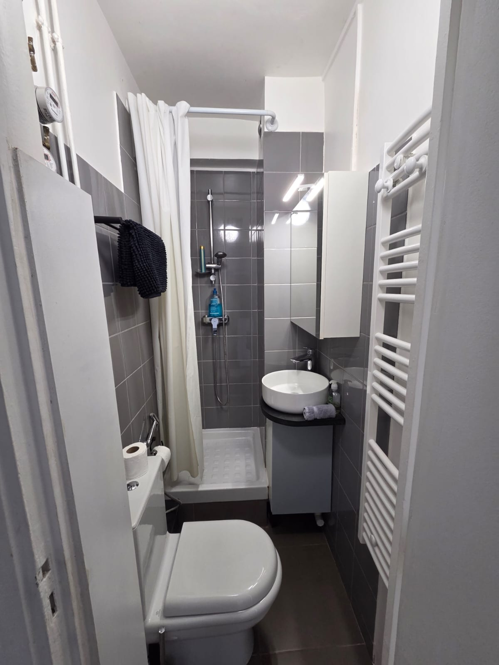 * une salle d'eau sans défaut avec douche, meuble vaque, sèche-serviettes et (vrai) WC,