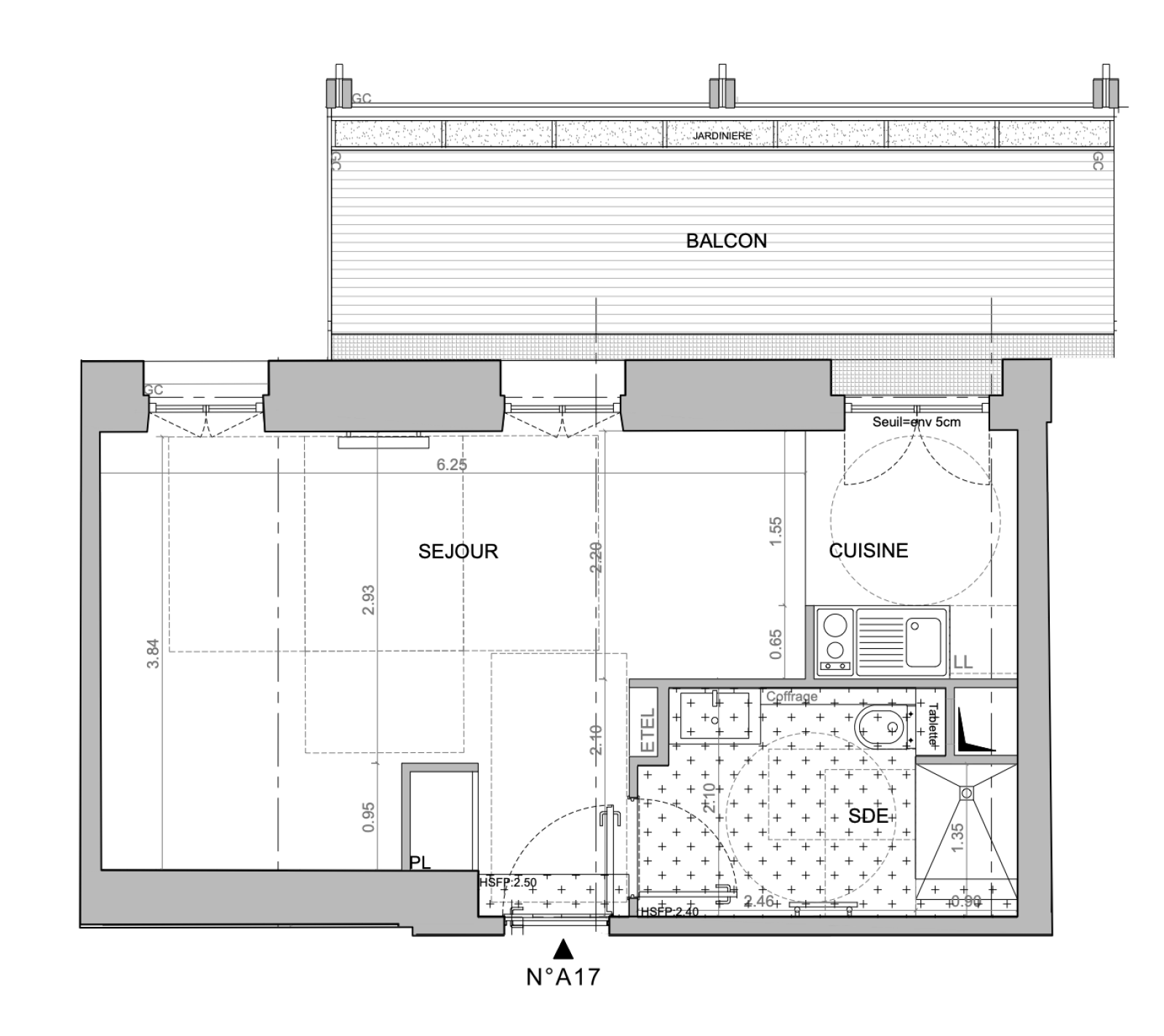 L’appartement comprend une entrée, un espace séjour de 20,10 m², une cuisine ouverte de 4,30 m² ainsi qu’une salle d’eau de 6,20 m². De plus, un grand balcon de 14,70m²
