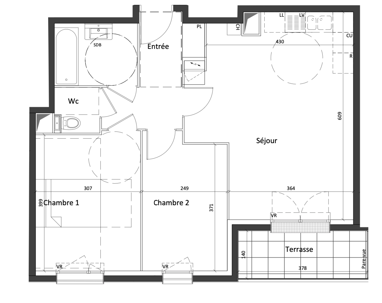 Le logement développe une surface habitable de 59,90 m². Il se compose d’une entrée de 6,35 m², d’un séjour avec cuisine intégrée de 25,30 m², donnant accès à une terrasse de 5,30 m².