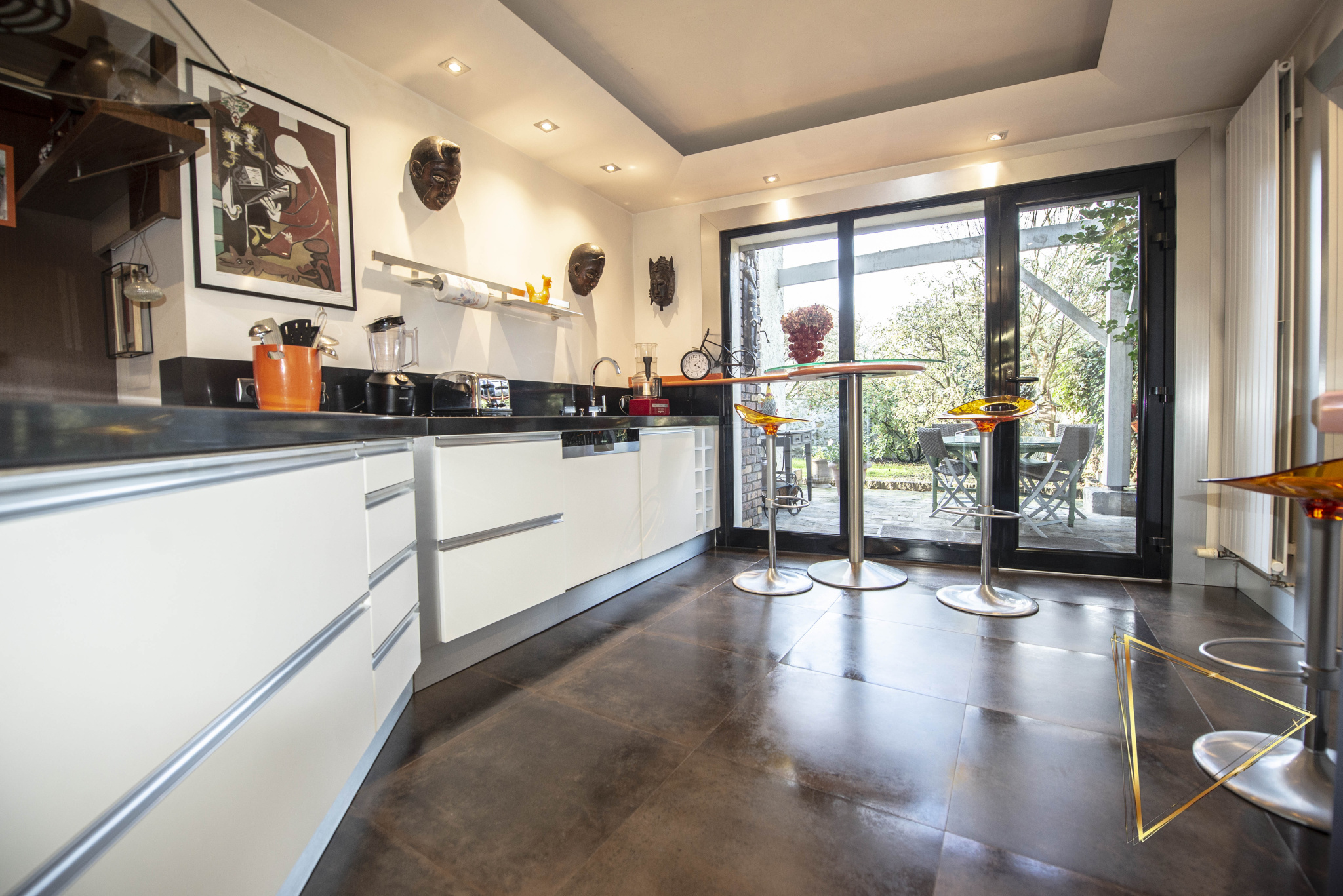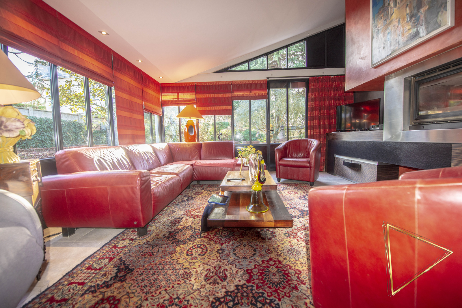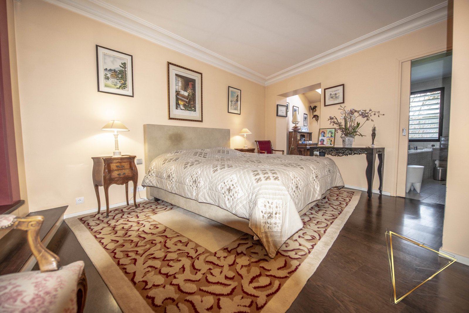 La première maison, d'une surface de 292m² habitables (425m² au sol), se distingue par ses volumes et son accessibilité PMR intégrale sur son plateau principal. Elle dispose d'un vaste séjour de 44 m², d'une cuisine sur mesure avec arrière-cuisine et d'une pièce de vie sous verrière avec cheminée centrale. L'espace nuit de plain-pied comprend deux grandes chambres de 16 m² avec salles de bains communicantes. Un duplex autonome de 150 m², intégré à cette même bâtisse, complète l'ensemble avec son propre salon, sa cuisine équipée, une suite de 20 m² et une grande terrasse indépendante.