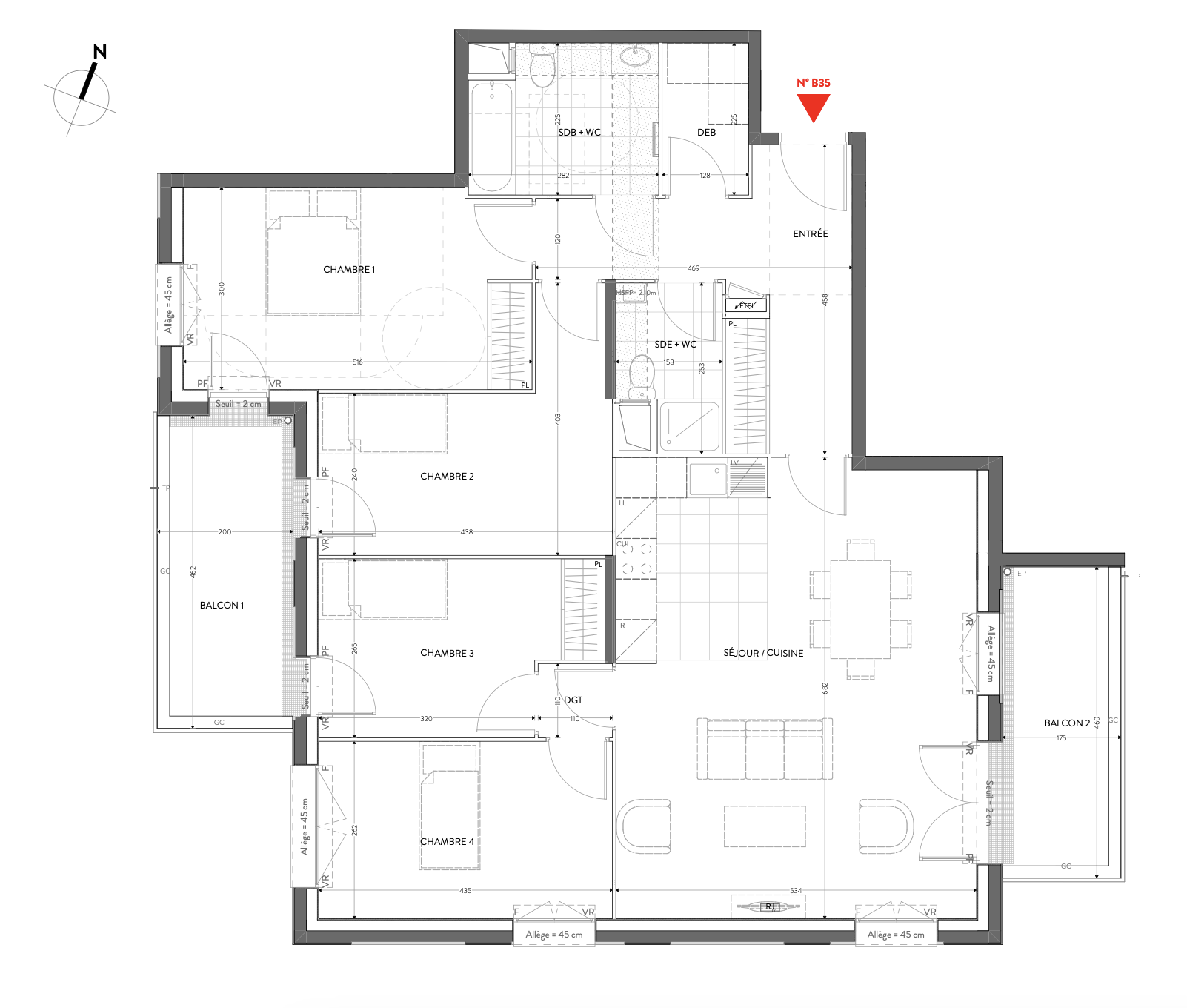 L’appartement se compose d’une entrée, d’un vaste séjour/cuisine de 36,01 m² prolongé par un premier balcon, de quatre chambres confortables (12,10 m² ; 10,03 m² ; 11,40 m² ; 15,27 m²), d’une salle de bains avec WC, d’une salle d’eau avec WC, d’un dégagement et d’un débarras. Les deux balcons totalisent 9,24 m² et 8,05 m², pour une surface totale de 127,05 m². Prestations de qualité : volets roulants, rangements, pièce technique/logement, et distribution fonctionnelle.