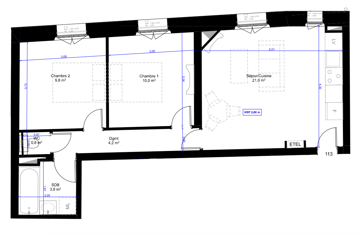 L’appartement offre une surface de 49,60 m² et se compose d’un séjour avec cuisine intégrée de 21,00 m², constituant l’espace de vie principal. Un dégagement de 4,20 m² dessert l’ensemble des pièces.