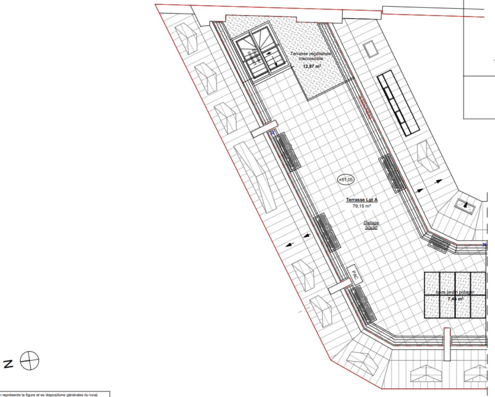 Un escalier intérieur mène à la terrasse sur le toit, véritable prolongement du séjour, où se trouvent une partie végétalisée et une zone aménageable en coin repas ou détente.