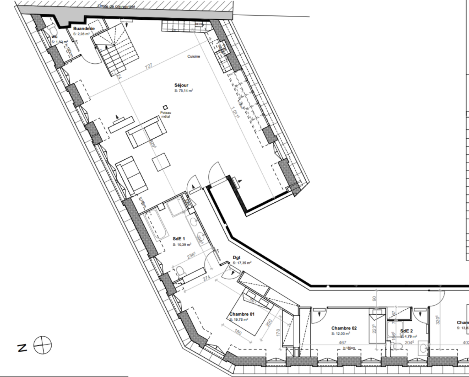 La partie nuit se compose d’une suite principale avec salle de bains privative comprenant baignoire, douche et toilettes, ainsi que de deux chambres supplémentaires disposant chacune d’un accès à une salle d’eau. L’ensemble offre une organisation fluide et fonctionnelle.