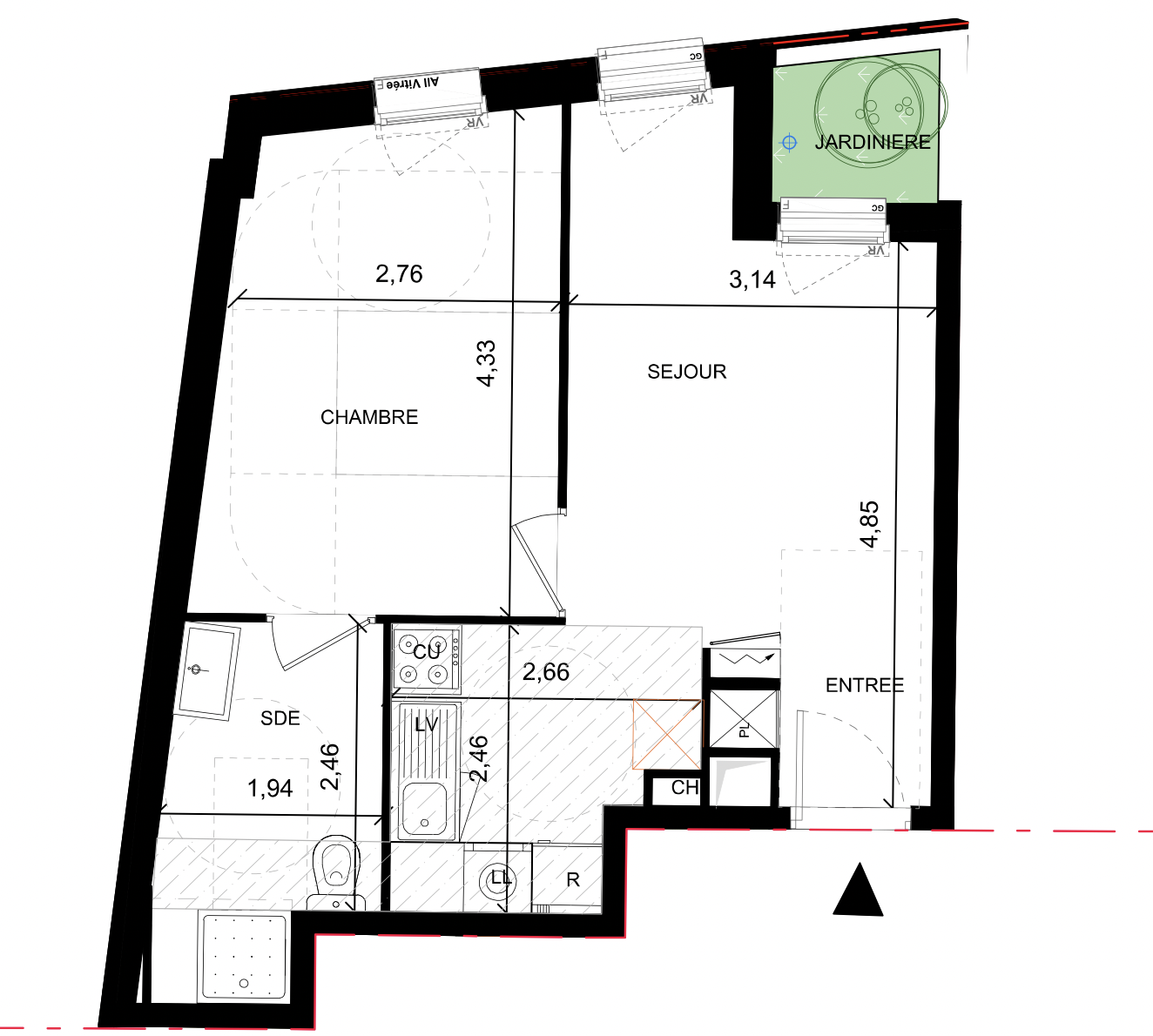 Le logement se compose d’un séjour avec cuisine intégrée de 20,60 m², formant un espace de vie fonctionnel. La chambre de 12,30 m² est distincte de la pièce principale. Une salle d’eau de 4,70 m² complète l’ensemble.