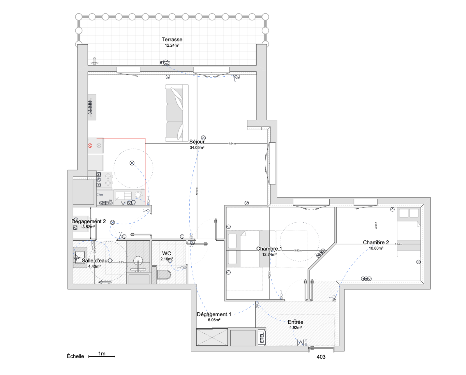 Sa distribution fonctionnelle propose un vaste séjour avec cuisine ouverte, deux chambres spacieuses, une salle d’eau, et une terrasse.