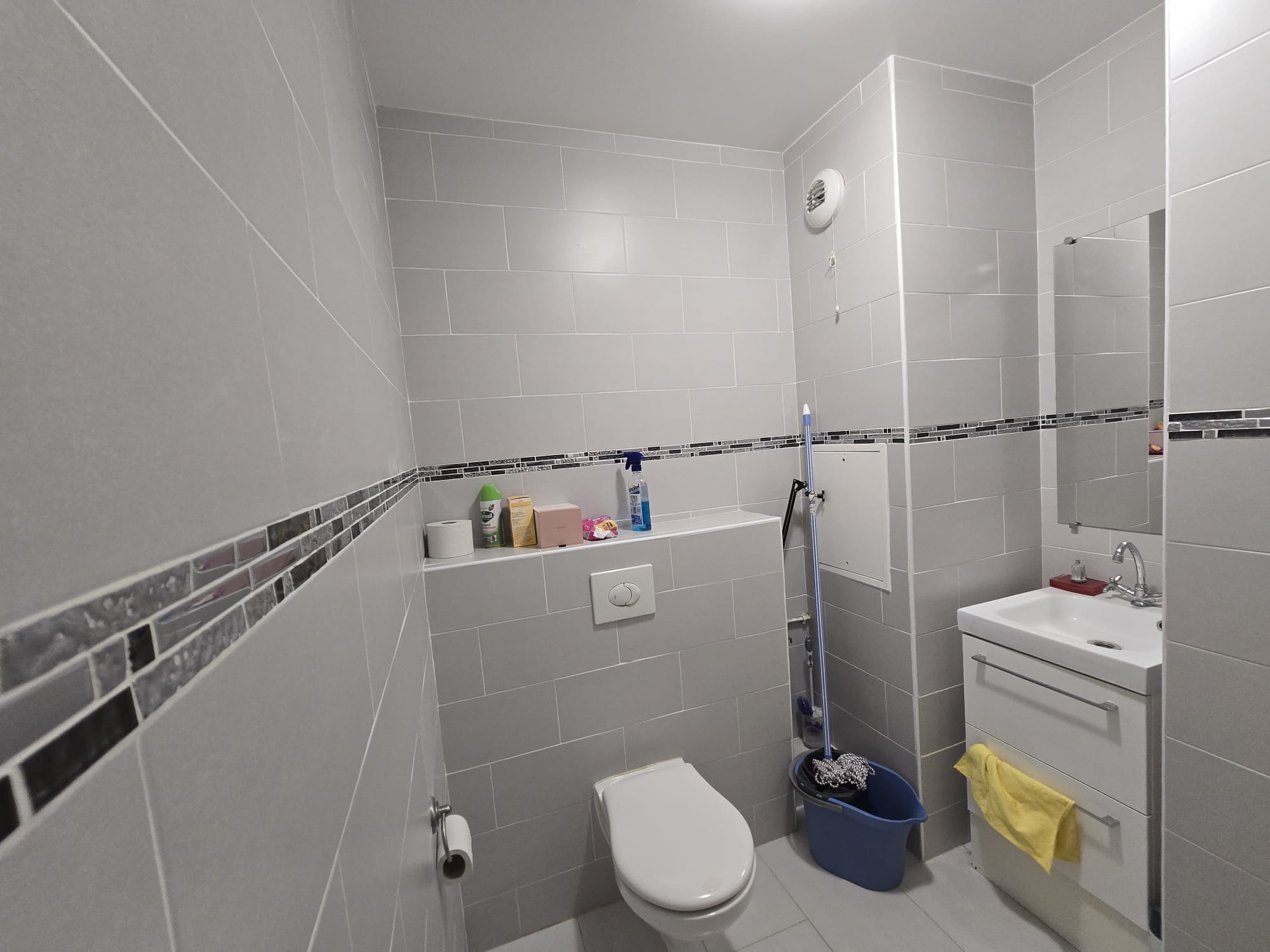 Parquet massif dans les pièces sèches, carrelage grand format dans les pièces humides, faïence tous murs / toute hauteur dans la salle de bain et les WC... Très belles prestations !