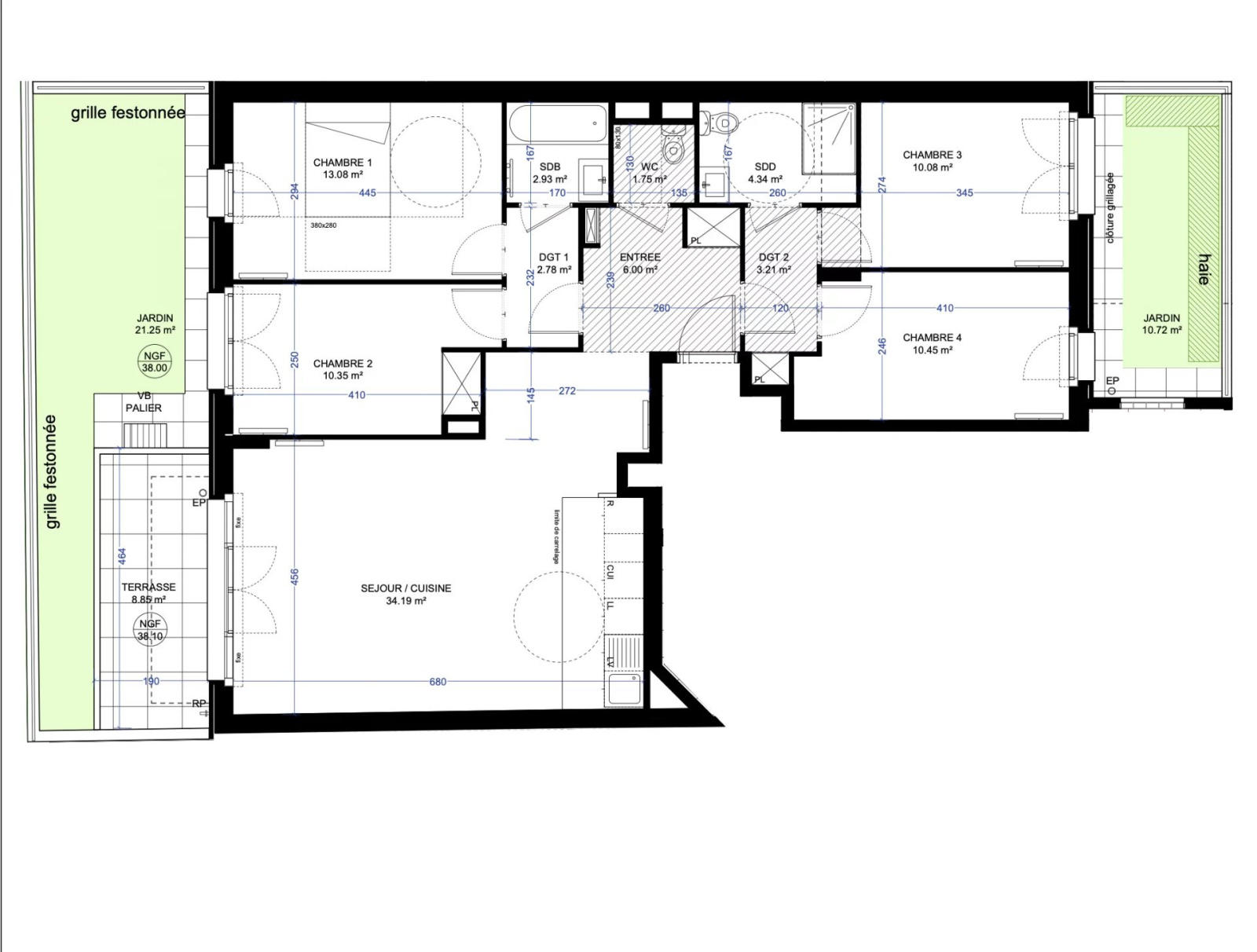 T5 en rez-de-jardin avec terrasse, jardins et parking.